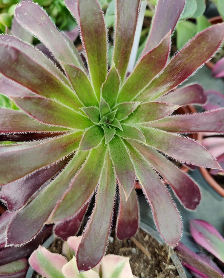 Rosette dense de feuilles étroites rouges au cœur vert.